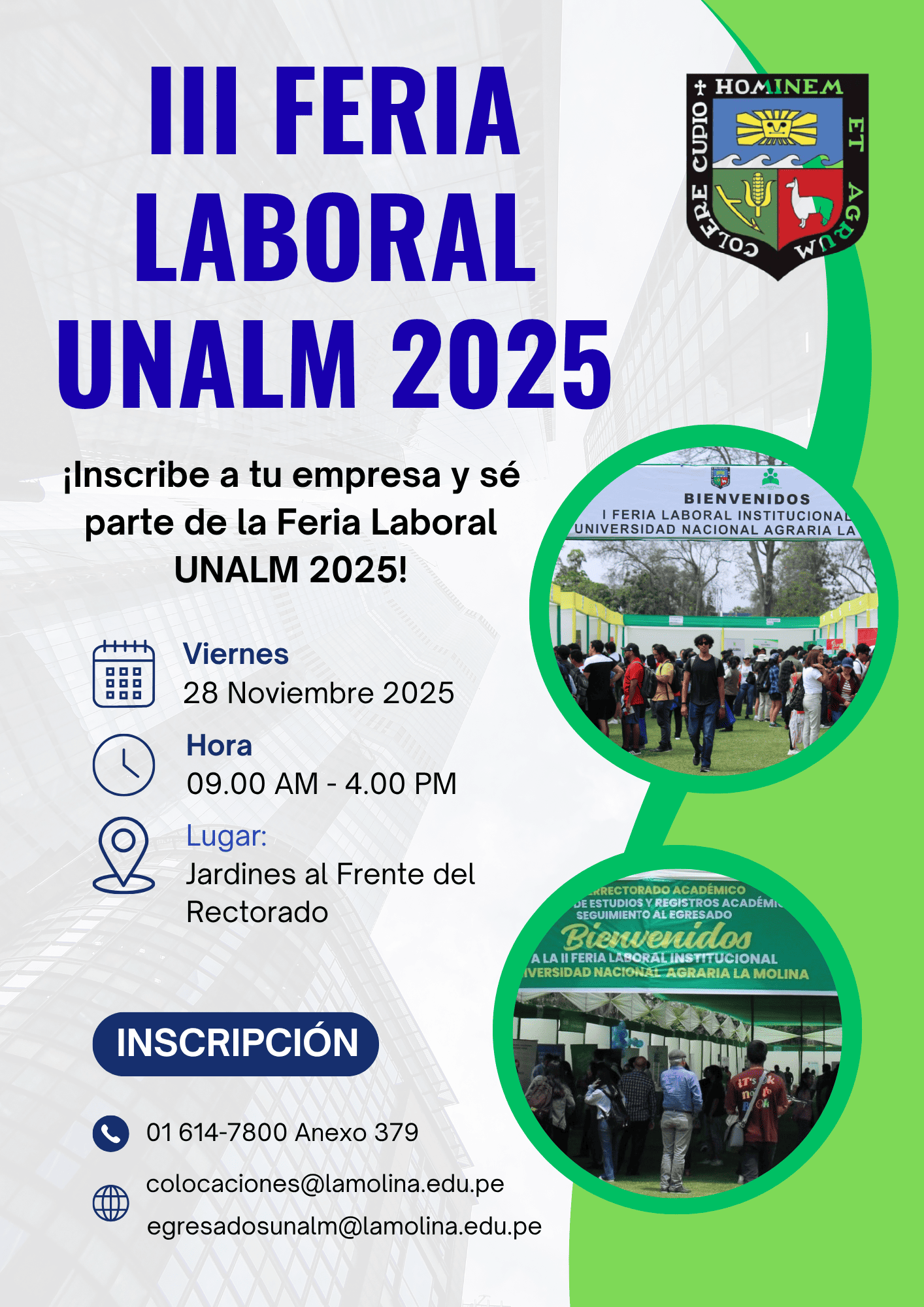 🚀 ¡Atención comunidad UNALM! 🌱 Este viernes 28, desde las 8:00 a.m., participa en la III Feria Laboral 2025 en los jardines frente al Rectorado. 🙌 Un espacio dirigido a estudiantes y egresados para conectarse con empresas, acceder a prácticas Leer Mas