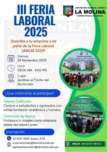🚀 ¡Atención comunidad UNALM! 🌱 Este viernes 28, desde las 8:00 a.m., participa en la III Feria Laboral 2025 en los jardines frente al Rectorado. 🙌 Un espacio dirigido a estudiantes y egresados para conectarse con empresas, acceder a prácticas Leer Mas